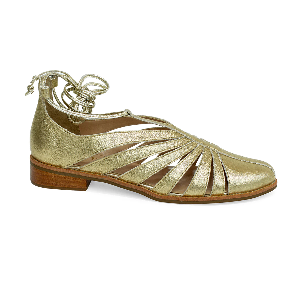 Sandália Salto Baixo confeccionado em Couro Mestiço Dourado com bico redondo e com palmilha interna de espuma proporciona conforto e leveza e sua sola é em borracha para melhor aderência.